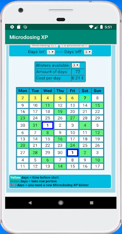 App to find the dates to take the microdoses according to Stamets, Fadiman or individual settings.