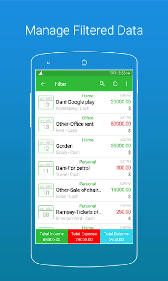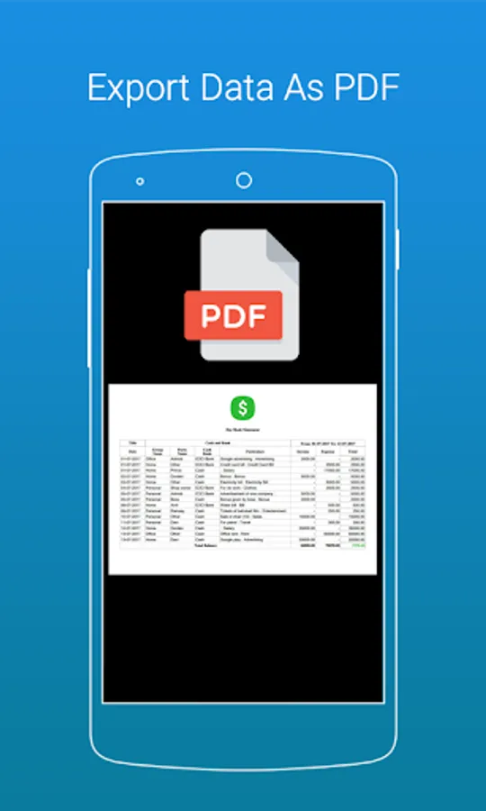 Unlimited free fetures like transactions, add bank, add income n expense category, add party, and unlimited export pdf files with account data backup and restore.