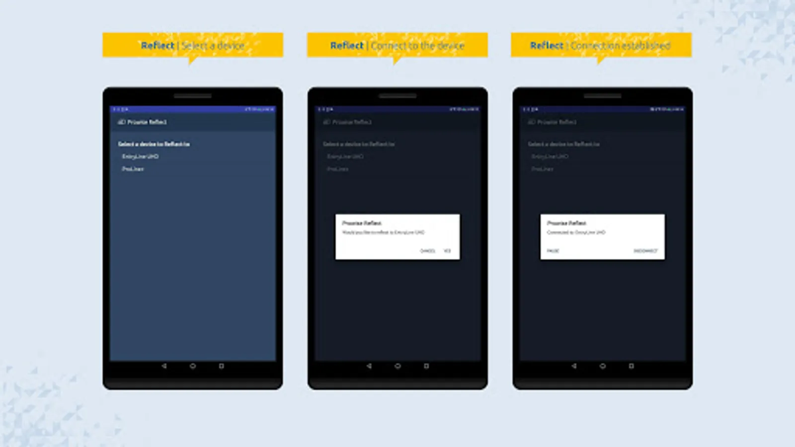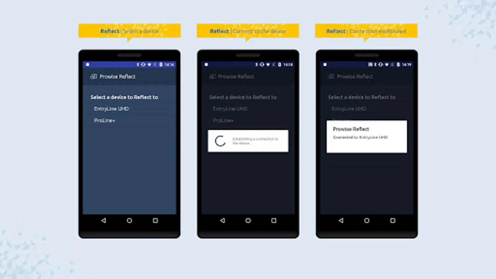 Prowise Reflect allows you to display your screen onto the touchscreens of Prowise whom are equipped with Prowise Central. Prowise Central is the integrated operating system allowing you to navigate quickly and easily to all main features of your ProLine+, EntryLine UHD, Prowise Touchscreen, TS One and TS Ten