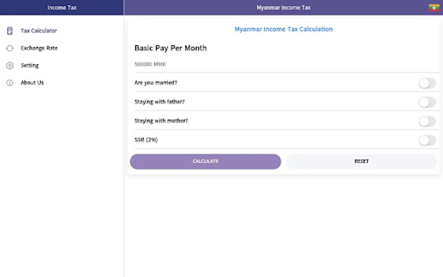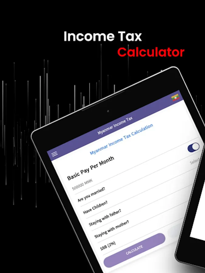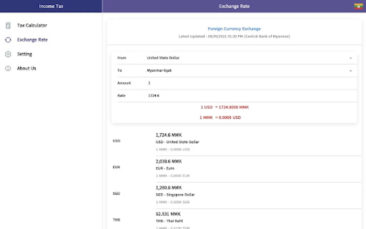 မြန်မာနိုင်ငံအတွက် ဝင်ငွေခွန်တွက်ချက်နိုင်သော App တစ်ခုဖြစ်ပါသည်။ ဝင်ငွေခွန်တွက်ချက်ရန်အတွက် လိုအပ်သော Tax Setting များကို ပြင်ဆင်သတ်မှတ်နိုင်ပါသည်။ မြန်မာနိုင်ငံတော် ဗဟိုဘဏ်၏ နိုင်ငံခြားငွေကြေးလဲလှယ်နှုန်းများကိုလည်း ဖော်ပြထားပါသည်။ Currency Converter အနေဖြင့် အသုံးပြုနိုင်အောင်လည်း ဆောင်ရွက်ပေးထားသည်။ ဗဟိုဘဏ်မှ ထုတ်ရောင်းလျှက်ရှိသော နိုင်ငံခြားငွေလေလံအရောင်းများကို February, 2021 မှစတင်ပြီး ထုတ်ကြည့်နိုင်အောင် ဆောင်ရွက်ပေးထားပါသည်။