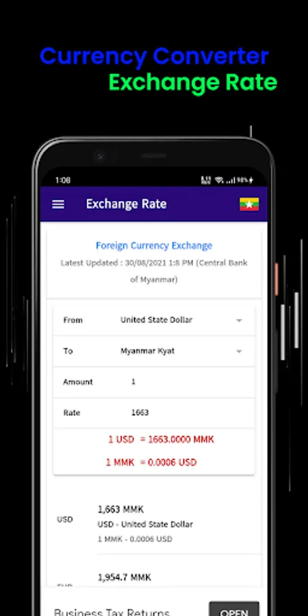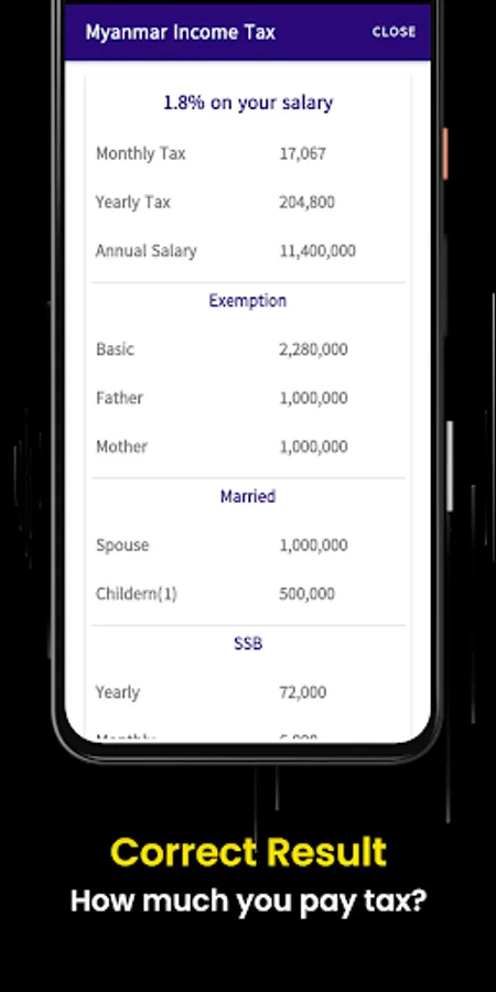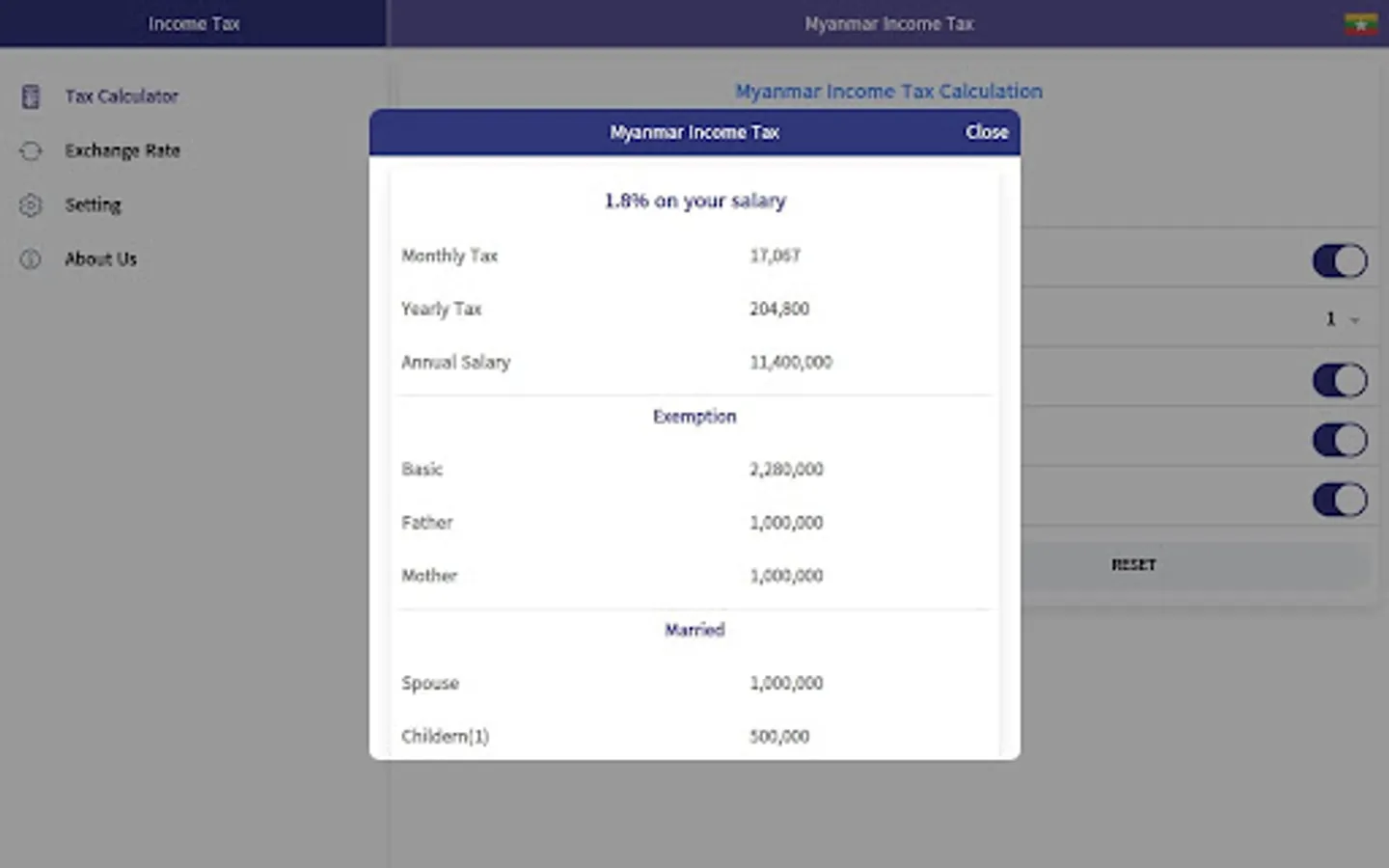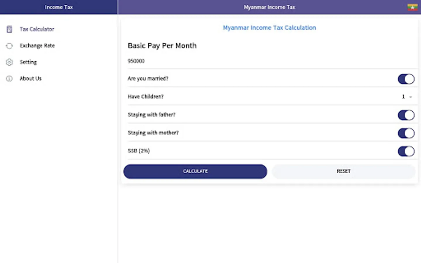 မြန်မာနိုင်ငံအတွက် ဝင်ငွေခွန်တွက်ချက်နိုင်သော App တစ်ခုဖြစ်ပါသည်။ ဝင်ငွေခွန်တွက်ချက်ရန်အတွက် လိုအပ်သော Tax Setting များကို ပြင်ဆင်သတ်မှတ်နိုင်ပါသည်။ မြန်မာနိုင်ငံတော် ဗဟိုဘဏ်၏ နိုင်ငံခြားငွေကြေးလဲလှယ်နှုန်းများကိုလည်း ဖော်ပြထားပါသည်။ Currency Converter အနေဖြင့် အသုံးပြုနိုင်အောင်လည်း ဆောင်ရွက်ပေးထားသည်။ ဗဟိုဘဏ်မှ ထုတ်ရောင်းလျှက်ရှိသော နိုင်ငံခြားငွေလေလံအရောင်းများကို February, 2021 မှစတင်ပြီး ထုတ်ကြည့်နိုင်အောင် ဆောင်ရွက်ပေးထားပါသည်။