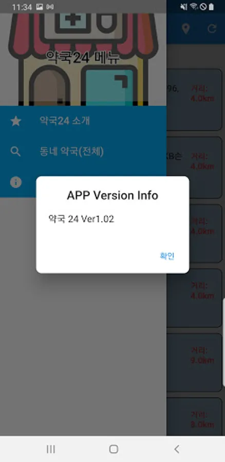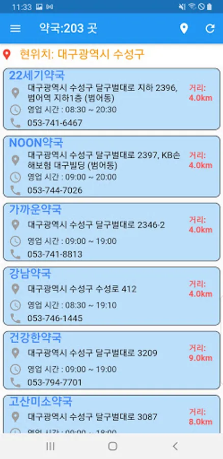 - 약국의 주소/영업시간/현재 위치에서의 거리 표시