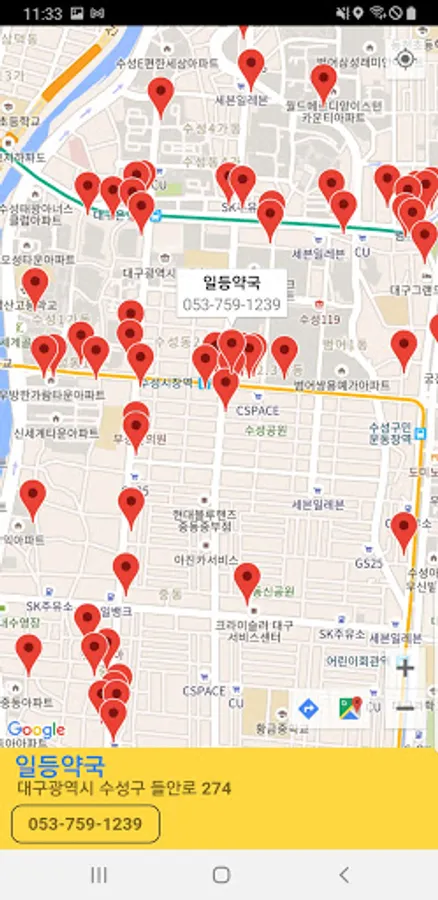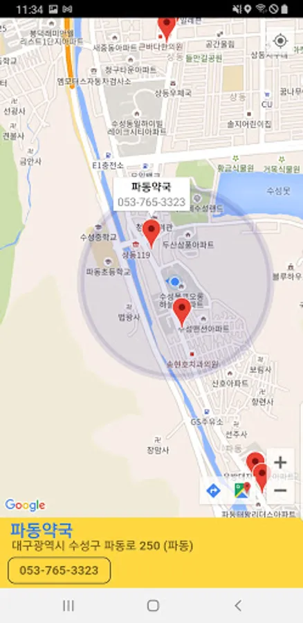 - 우측 상단의 지도 아이콘 클릭시 약국 위치를 구글맵으로 한눈에 볼수 있음