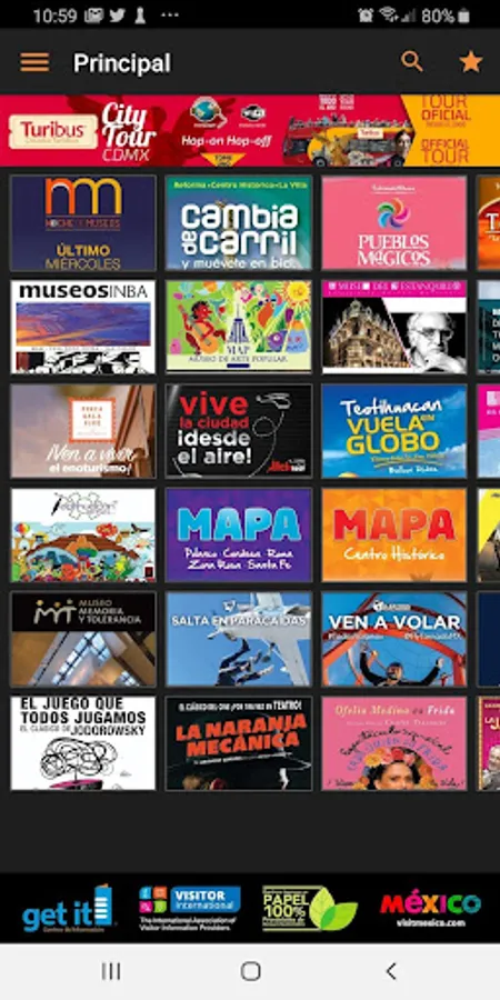 Get it app is the application of the Get It Information and Entertainment Centers that you typically find in the main hotels worldwide. Divided into fourteen categories to make your navigation easier, thirteen focused exclusively on Mexico City, which are: Shopping, Culture, Sports, Education, Show, Maps, Museums, Leisure, Parks, Restaurants, Wellness, Tours, Transportation and Hotels; as well as a more called Destinations, which leads you to discover the most beautiful places in the Interior of the Republic.