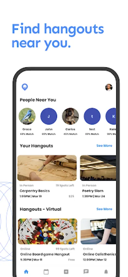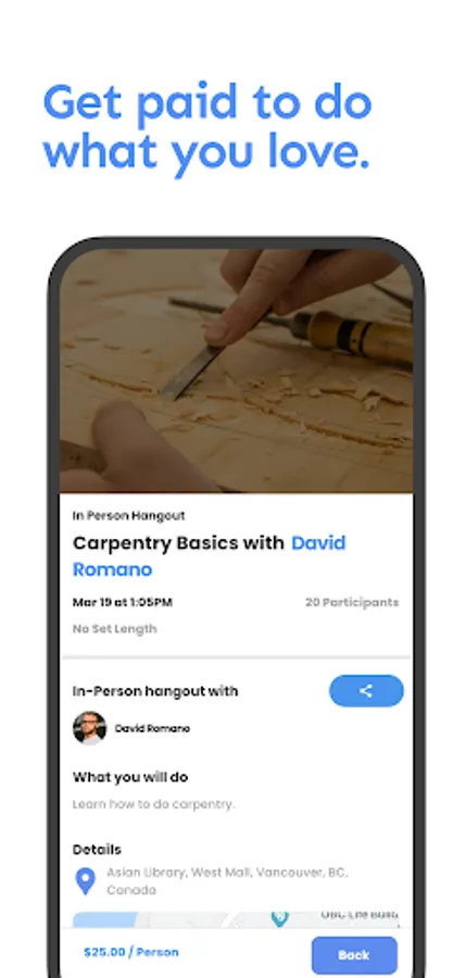 People can discover new people and hangouts hosted by local hosts in-person or online. Hosts can list their hangouts, find interested people in their area, and earn money doing what they love while creating memorable experiences.