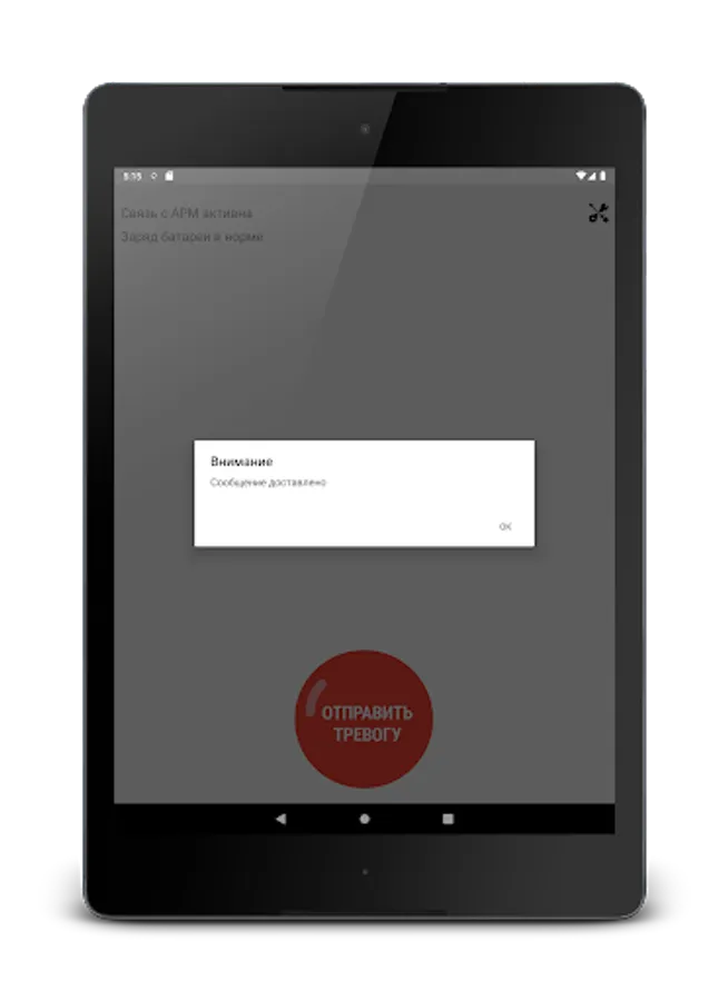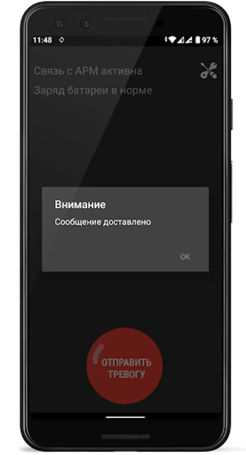 To transmit the alarm, you must press the big red button in the application. If the alarm is successfully transmitted, the message "Message delivered" is displayed.