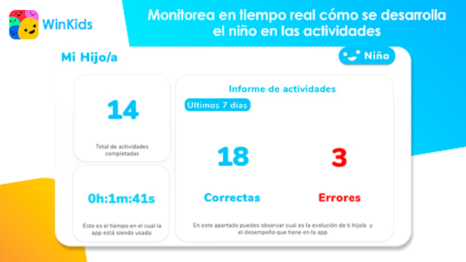 One of the most innovative options of DownBlue is to be able to monitor the development of your child in the applications, in the section for parents you can see how their cognitive and memory skills improve in the short and long term.