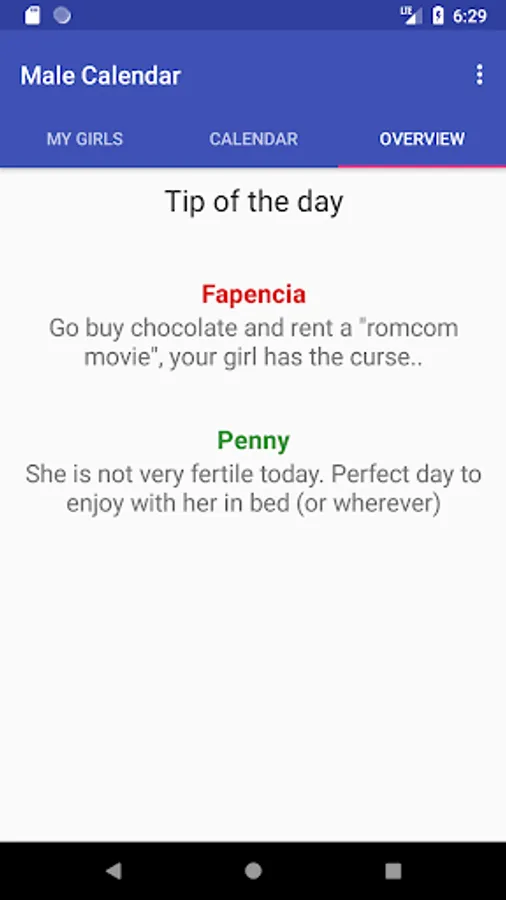 All those men's problems are over with Male Calendar. From our calendar you can check at a glance whether or not your girl is in days of period, in a clear and concise way. You will also receive a small tip for each day, with the right tone, which you will always choose.