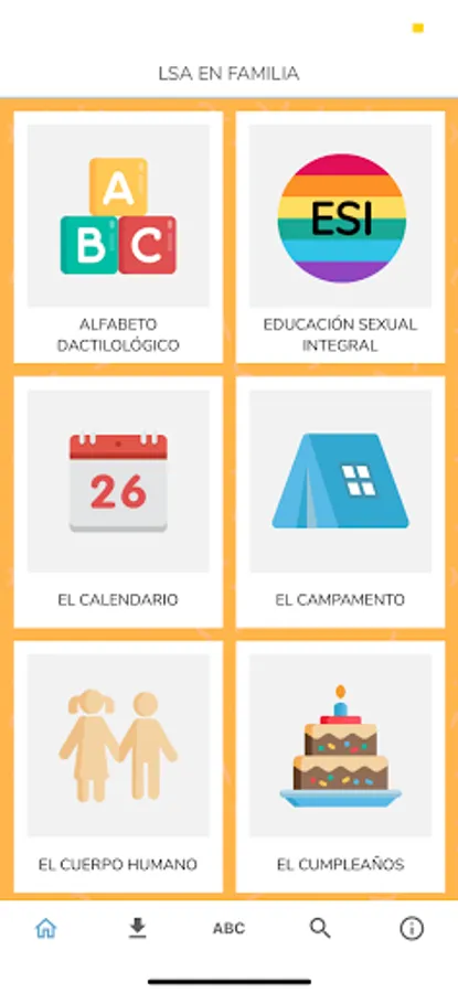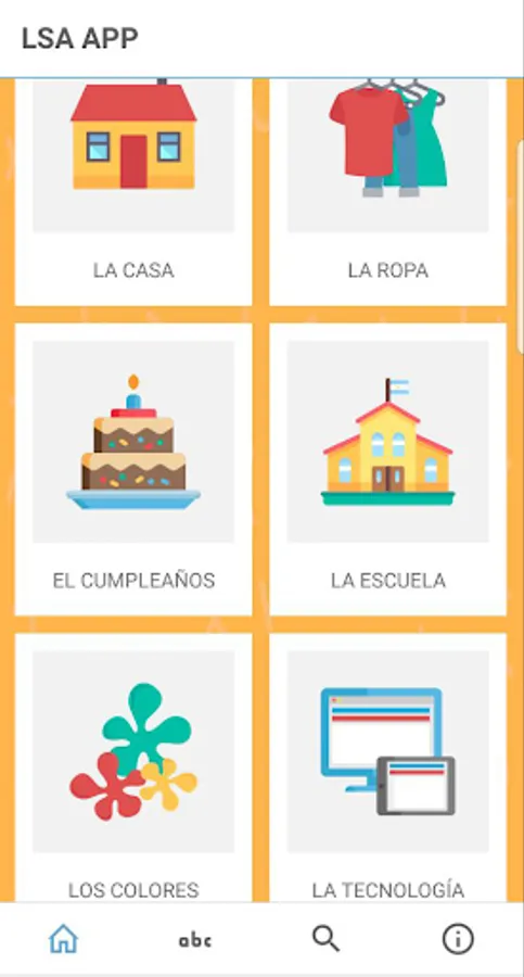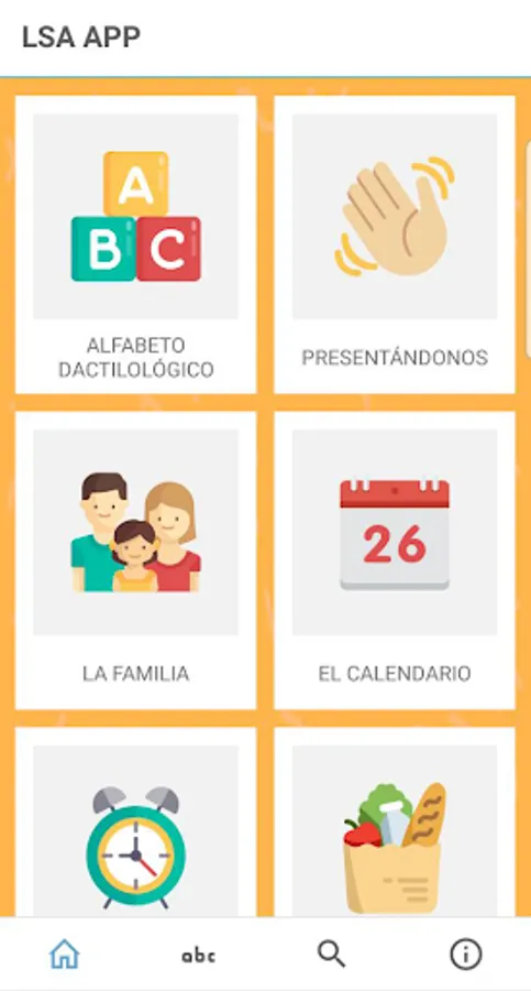 LSA en Familia is an application that favors communication through basic LSA signs in families with deaf children. It shows with images and videos that can be downloaded online how to interpret words related to daily life in LSA, grouped into different themes: home, school, clothes, food, but also feelings, the human body, the health and sex education, among others. LSA en Familia is also the first specific dissemination material of this type that includes videos made by deaf people in our country.