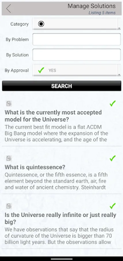3) Each new solution needs to be approved by an "Administrator" before it can be searched, then you need to "Manage Solutions", where you choose to approve and assign a category to it. This is to avoid inappropriate solutions to be viewed by the entire company.