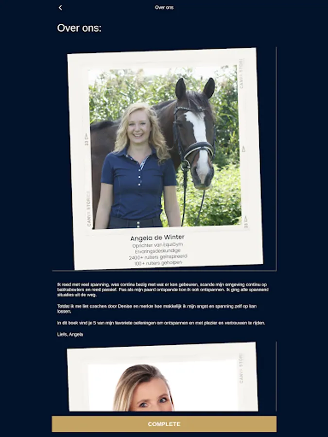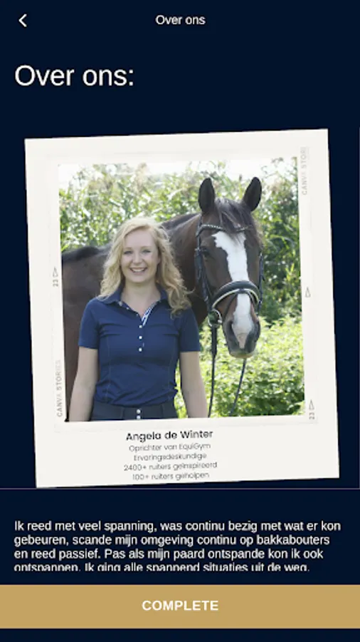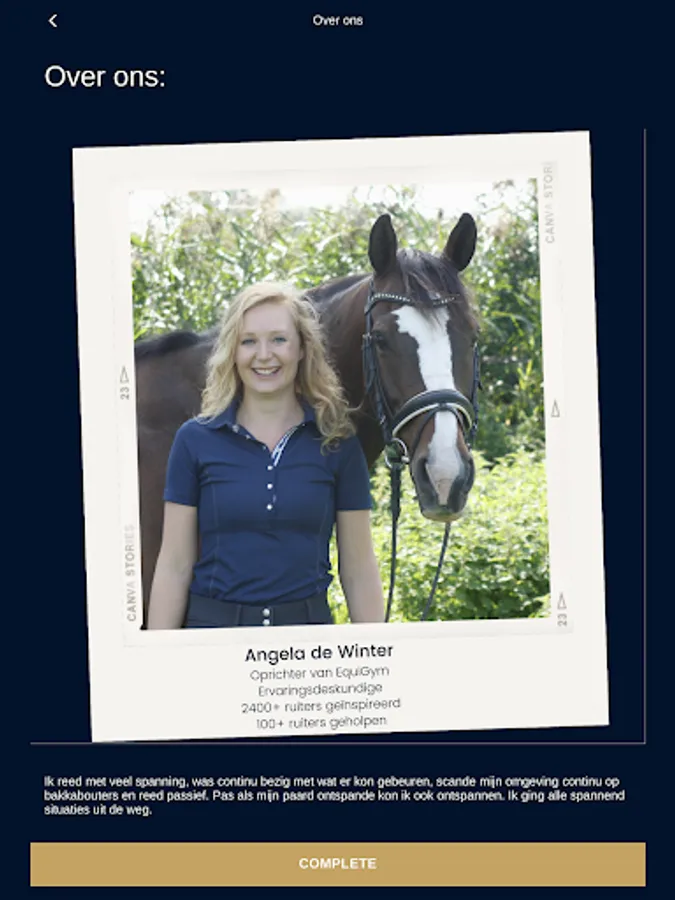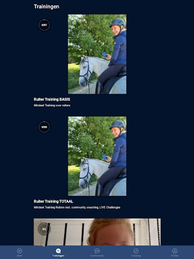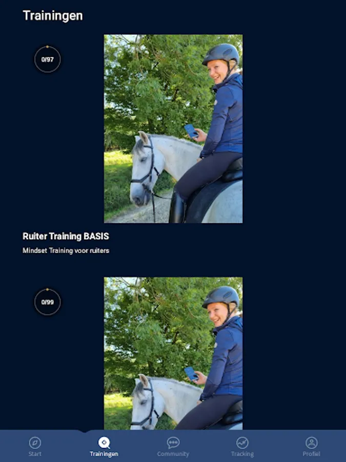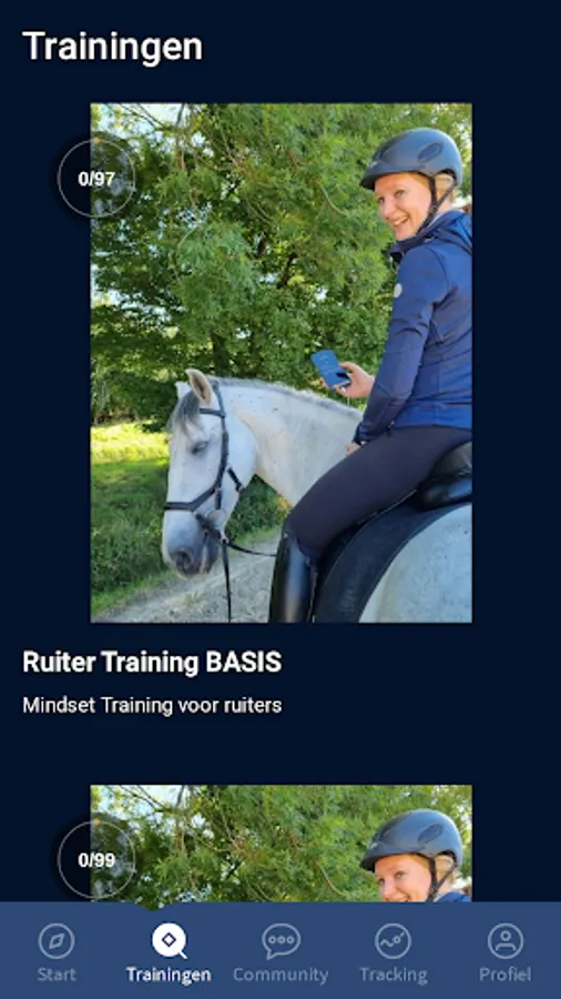 Online mindset trainingen speciaal voor ruiters in een handige app. Een goede rit begint bij de juiste mindset. Verbeter je rit via deze unieke en bewezen formule. Stel, track en haal je doelen, volg de training, doe mee aan challenges en connect met de trainers en gelijkgestemde ruiters in de community. Thuis, op stal of op je paard. Altijd in je broekzak, altijd bij de hand! Trainingen voor iedere ruiter, met specialisaties voor angstige, onzekere, gevoelige én perfectionistische ruiters.
