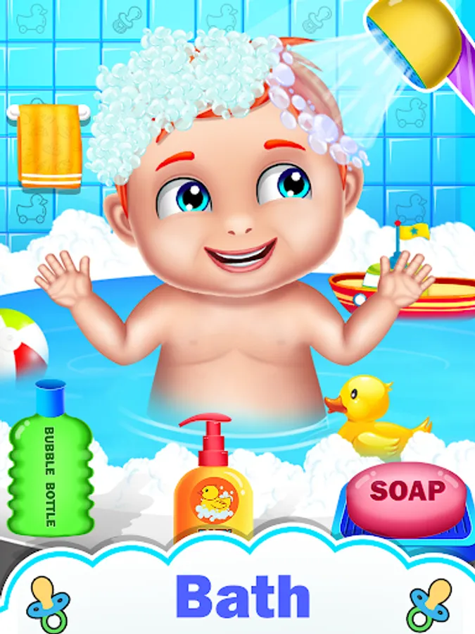 Choose a few toys to make the newborn jump for joy. Then wash the newborn with some soap and shampoo and wipe him softly with a towel. Let's have fun popping soap bubbles.