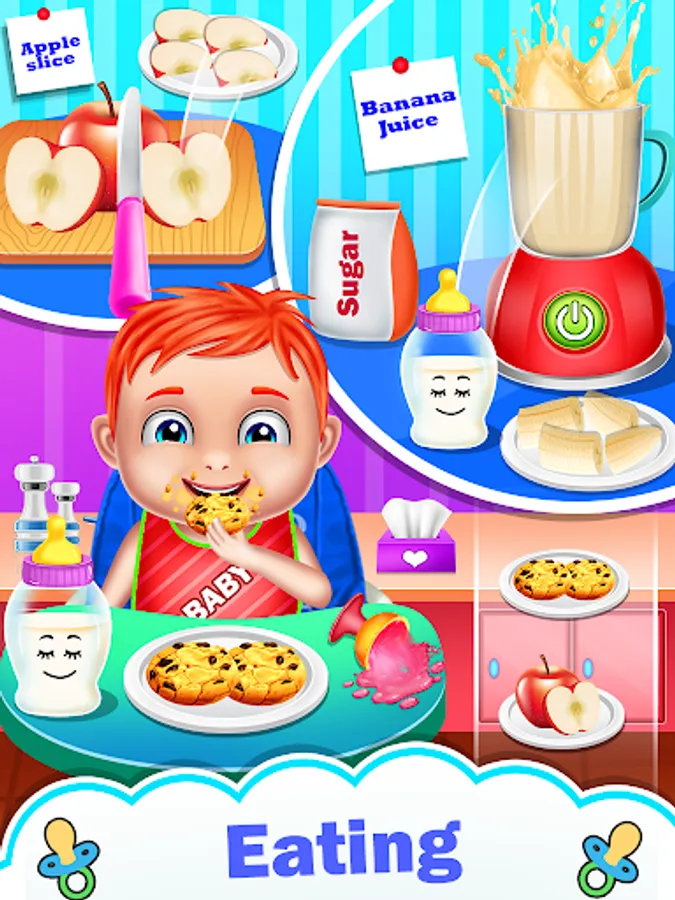 newborns need a delicious meal several times a day. Prepare 5 different types of food, powdered milk, banana juice, apple slice, cookies, ice-cream. Don't forget to use a napkin to clean the newborn mouth.