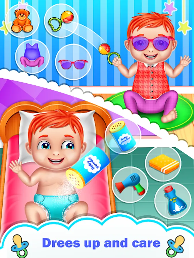 Here newborn care activities in 7 lovely scenes, like a funny bathing, Caring, Doctor treatment, trendy dressing, tasty food, beauty joyful toy, cleaning the room. newborns want you at the same time, so satisfy their wishes step by step!
