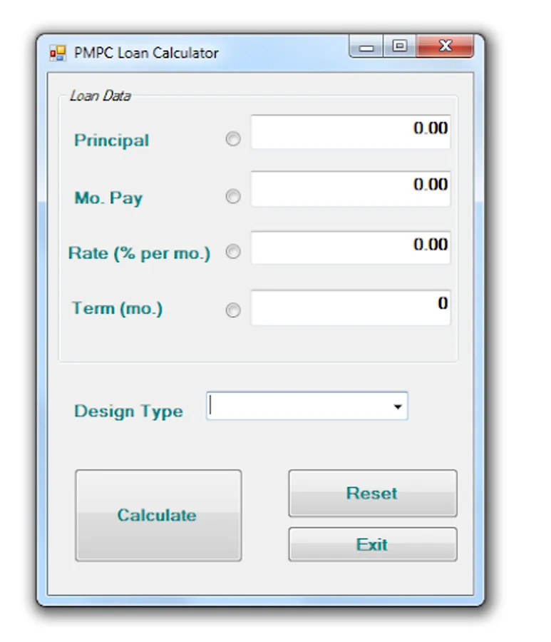 This app calculates the present value ( principal), amortization (monthly payment), rate (interest in %), and the number of terms through different type of cash flow (loan design):