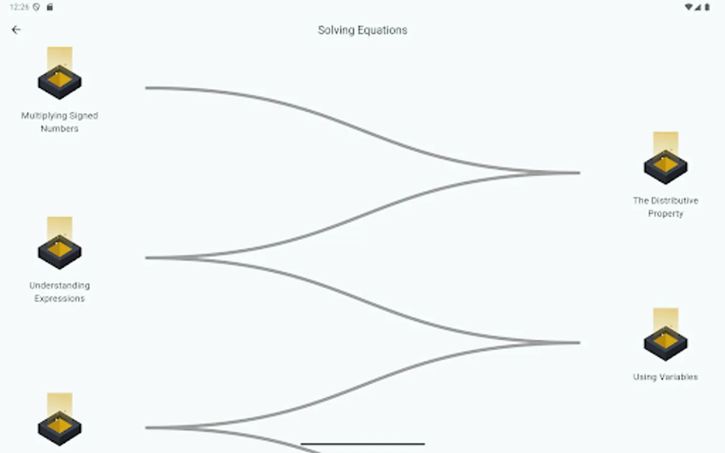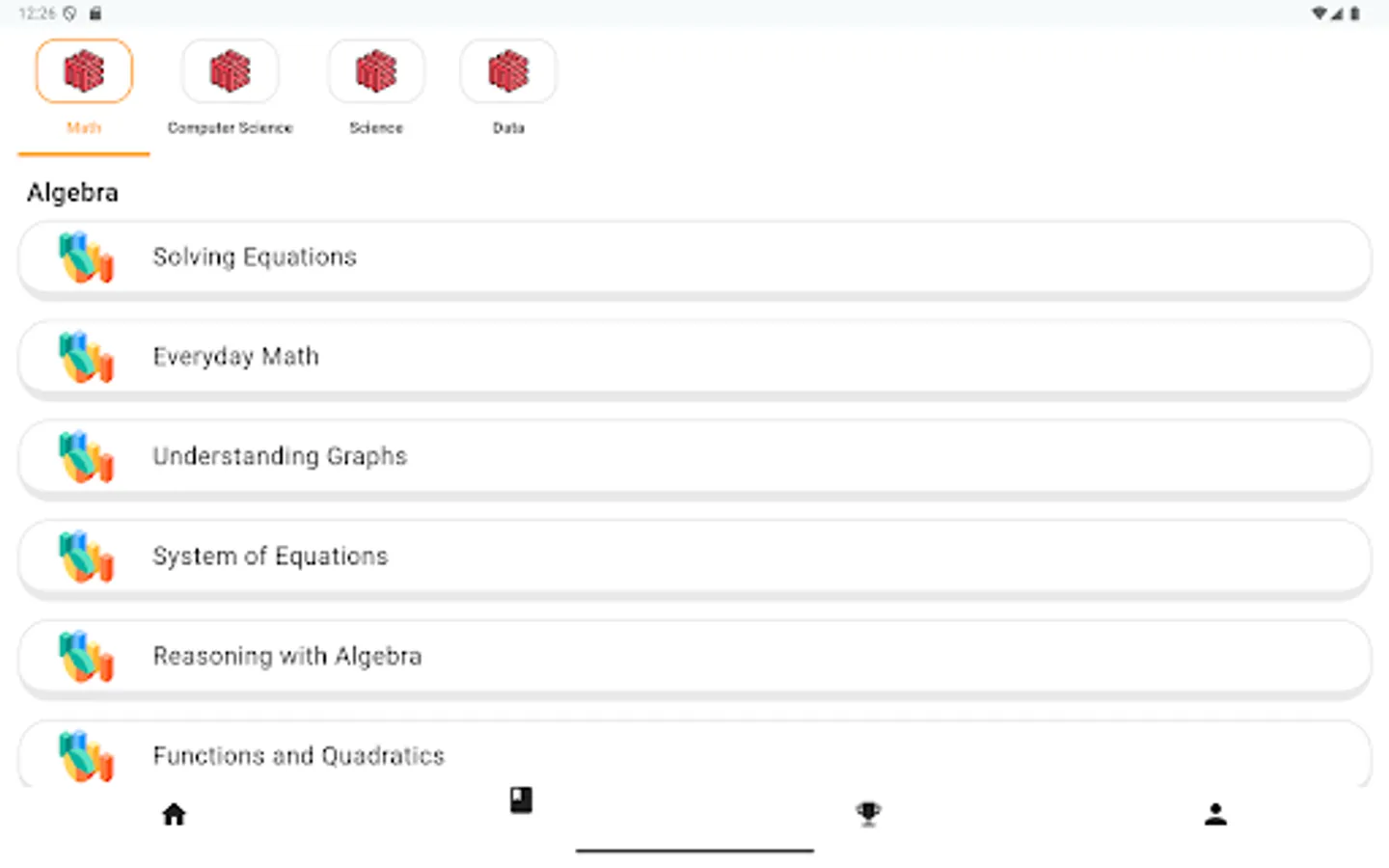 - Colorful, animated subject icons showing completion status