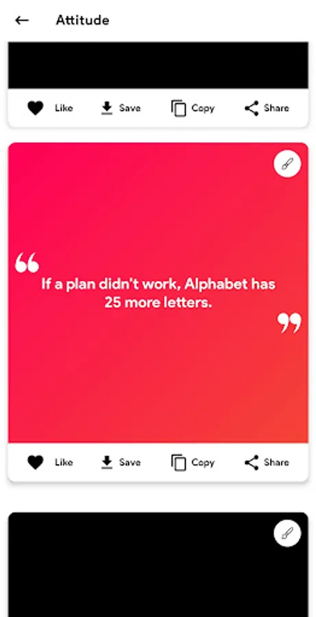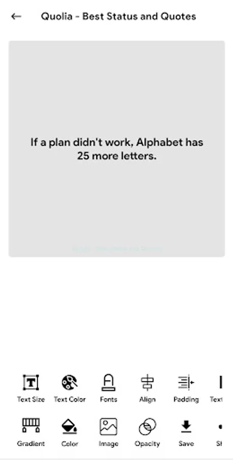 You can also change the background of the quote. This app has some of the great background that suits your quote. You can also add your own background from gallery. We also added many new categories background for different kind of quotes like business, Christmas, Happy New Year, creative writing, for love quotes, nature and some miscellaneous background. We also add few plain background for simple quotes and few background with different pattern texture.