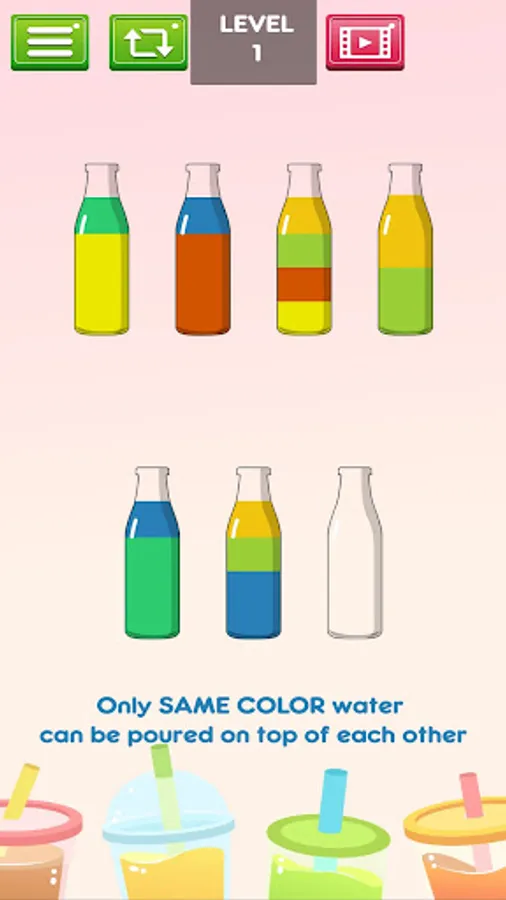 There is a fun rule of this water sort puzzle bottle games that you can only pour water of the same color at the top and the tube you are pouring has enough space in it. So be careful while filling up the cups using your puzzle pieces in this water color game. Accept the challenging levels of the color match and solve the color switch puzzle games.