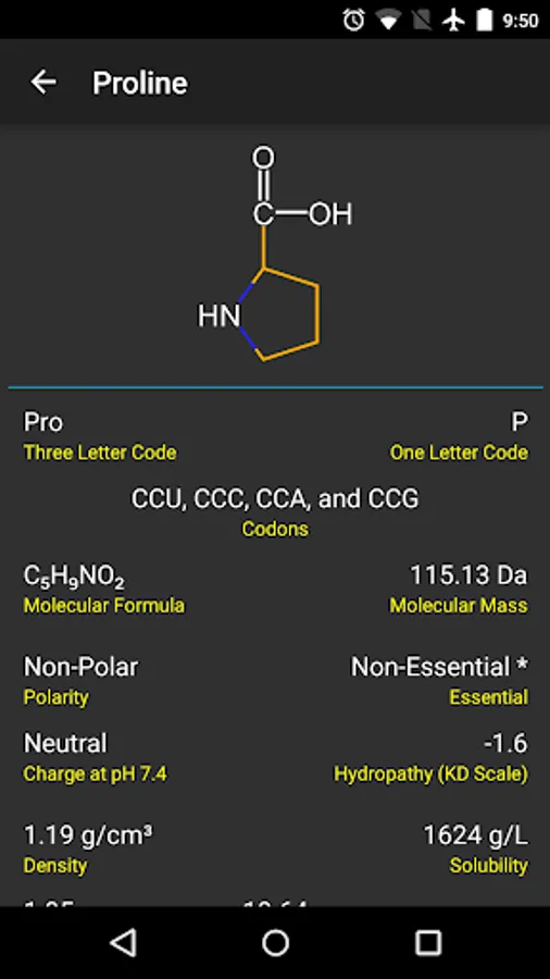 - Detailed information about: codes, codons, mass, formula, polarity, charge, hydropathy, density, solubility, pKa, etc.