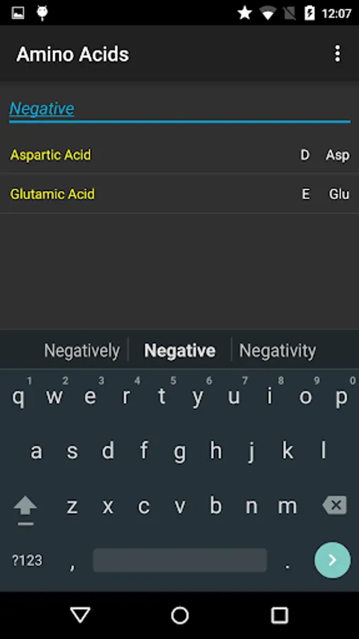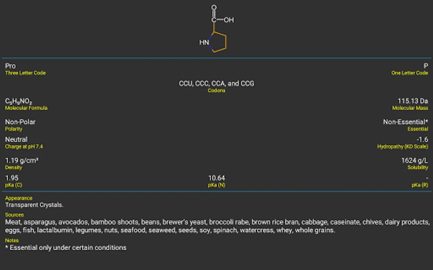 Amino Acids is a neatly organized study app with detailed information, and quiz questions for the 20 major amino acids.
