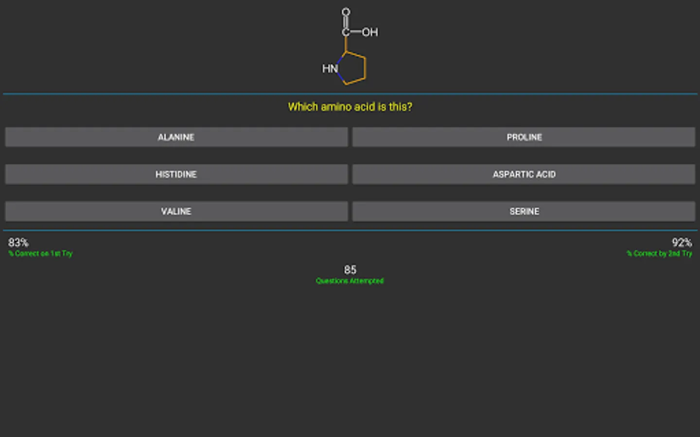 You can search the amino acids by name, code, codons, charge, and polarity! The quiz feature tests your knowledge of the structures, and provides feedback with simple stats.