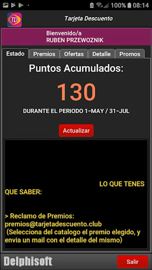 Discount Card benefits club. Control of points accumulated by purchase. Check the catalog of prizes, promos. Control your purchases