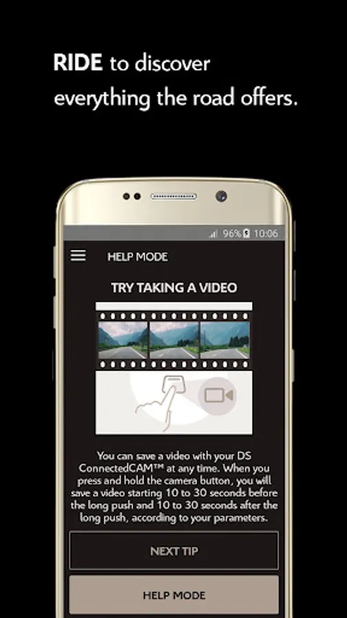 After wifi-pairing the camera on your smartphone, the DS ConnectedCam® app will automatically activate at startup and perform a video loop recording of your journeys.