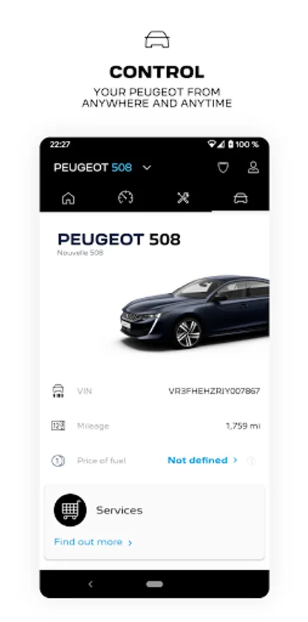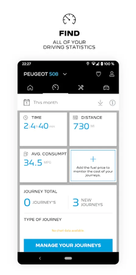 All PEUGEOT models are compatible with the MyPEUGEOT application. However, if your PEUGEOT is not equipped with Bluetooth or does not have the ability to use our Connected Services, the ‘Driving’ tab (which provides details of your journeys, fuel consumption and mileage) is not displayed. You can still enjoy all of the other features of the app.
