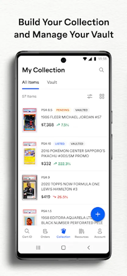 Verify and track your PSA submissions. List your Vaulted collectibles for sale instantly. Do it all within the PSA app. For certification verification, simply scan the barcode or key in the certification number to reveal grade, population, population higher, and more. To track your submissions, just log in to see when they arrived, what stage they're currently in and whether or not it has shipped with tracking. Vault your order to sell instantly on the Goldin Marketplace or Weekly Auction. Your collectibles are 100% insured and securely stored in our Vault.