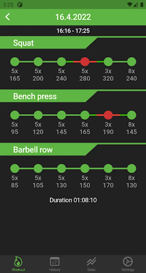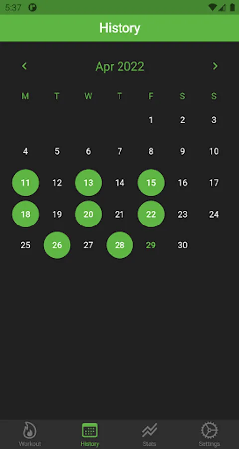 Browse your finished workouts in the history view and fill the calendar with those beautiful green bubbles. Remember - consistency is the key.