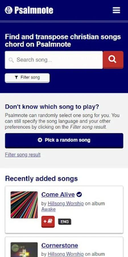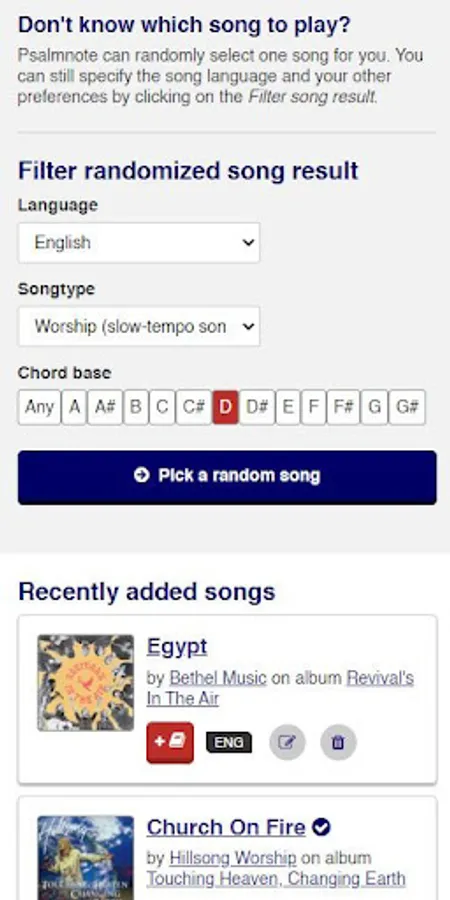 If you don't know what song to play you can click on the Shuffle play button on the homepage and Psalmnote will randomly pick a song for you. You can define the language, chord base, and song type of the randomized song by clicking on the Filter song result under the Shuffle play button. After you see the randomized song, you can click on the Re-shuffle button to get another song if you don’t know the picked song or if you just want to pick another one.