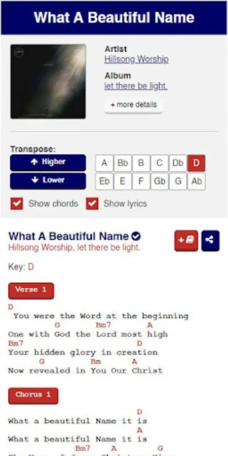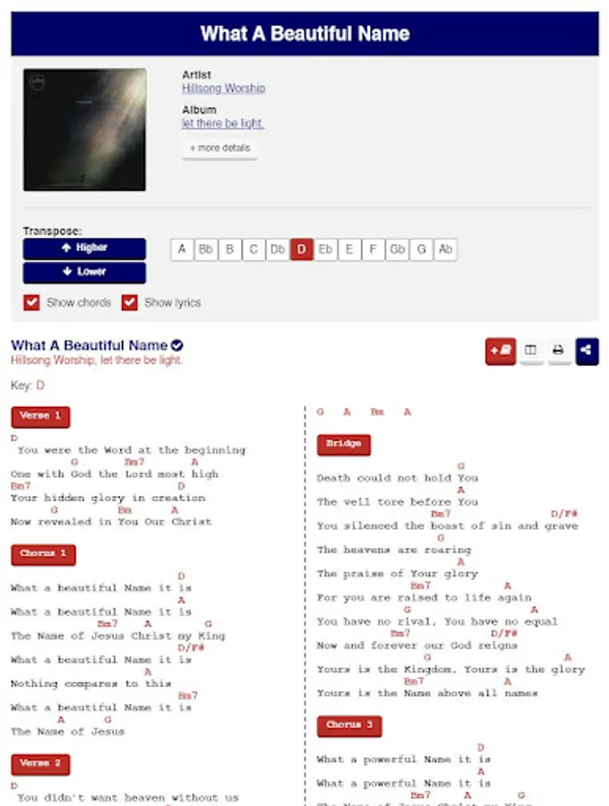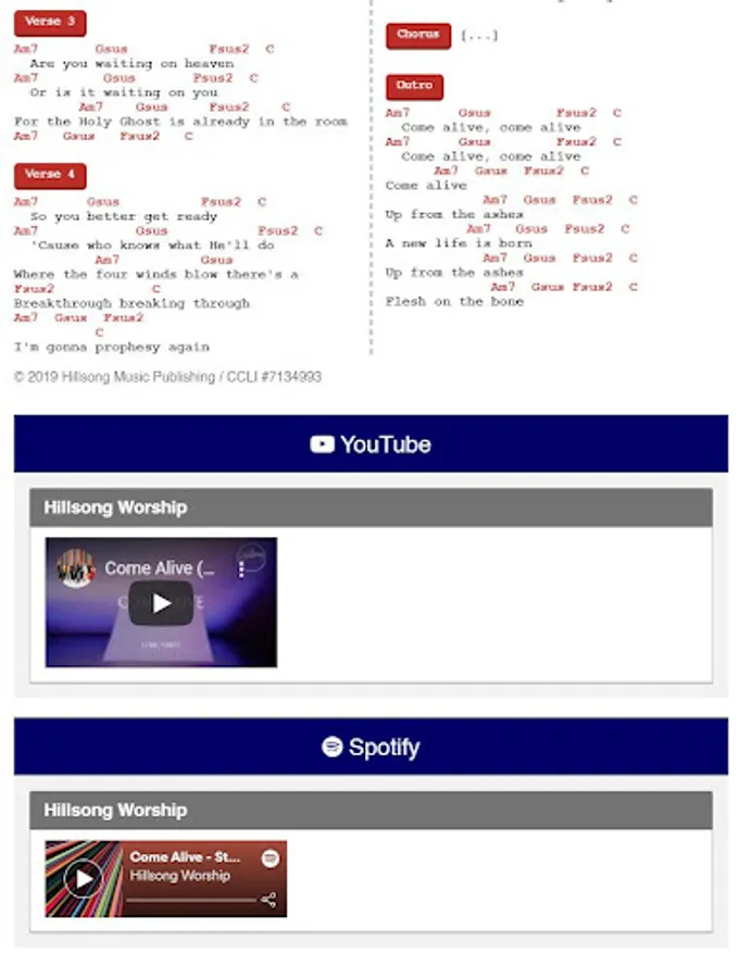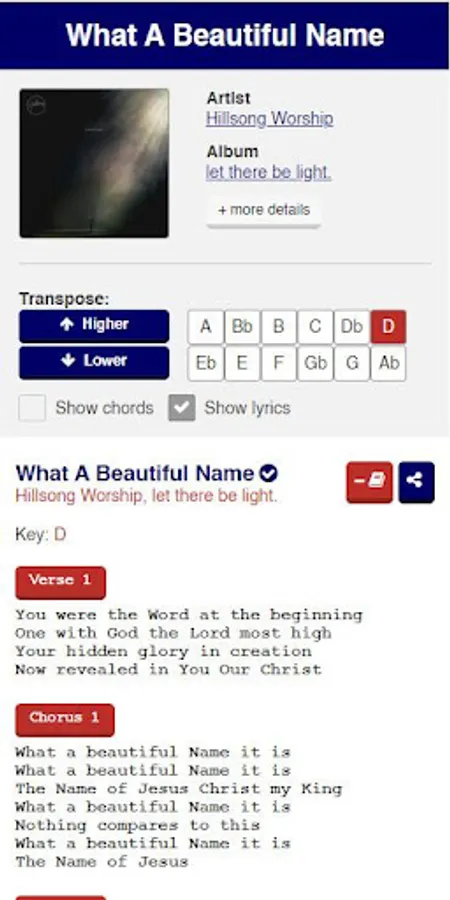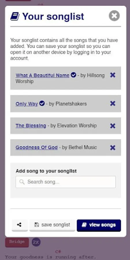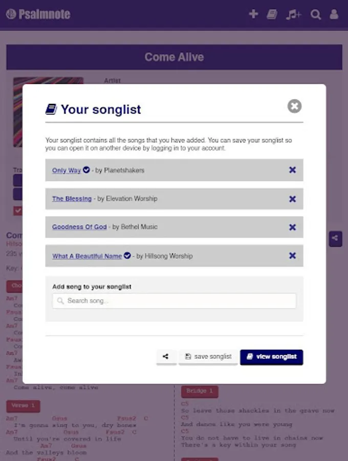 You can put multiple songs in a song list. When you view your song list, all the songs inside the list will be visible in one page and this will be useful to compile songs you will play for the upcoming a church service! You can optionally save this as your personal song list to be used in the future when you need it and you can find back all your saved song lists in your profile page.