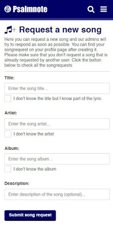 Do you play guitar, piano or other instruments? You can be a blessing to other people. You can contribute, adding new songs to Psalmnote. We will review the songs you added as soon as possible. If all the lyrics are complete, chords are readable, and album/artist information are correct, then your songs will be public to all other Psalmnote users.