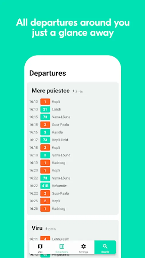 Public transit routes and schedules at a glance, with alternative options like e-scooters and bikes.