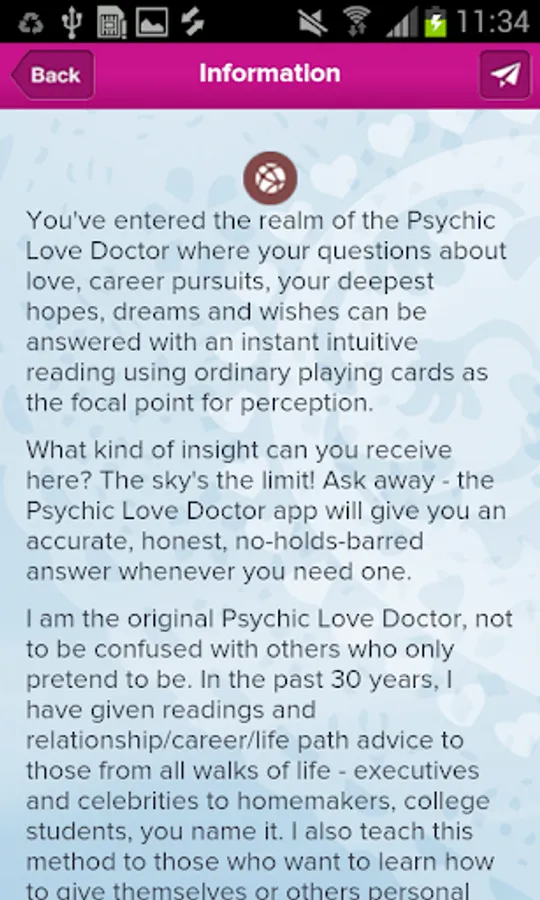 The Psychic Love Doctor is in -- Get a free psychic reading using ordinary playing cards any time you feel you need special insight about your life - instantly! Readings are not restricted to romance and relationships, feel free to ask away on any and all situations in your life. Receive solid, meaningful answers with a simple tap of a finger. Private confidential consultations also available.