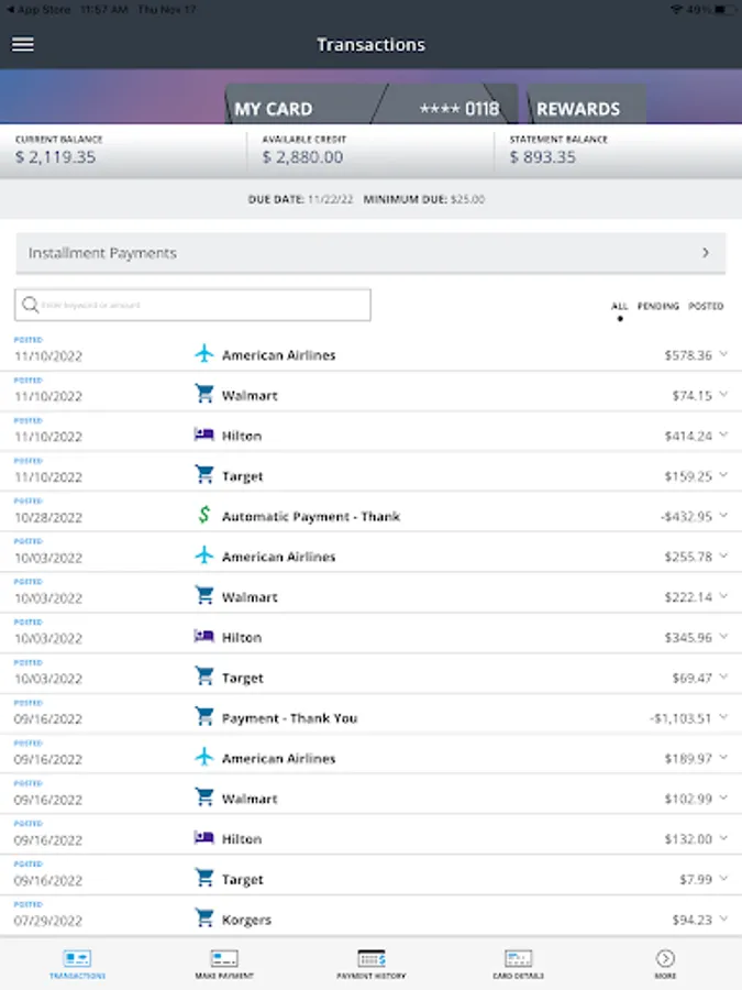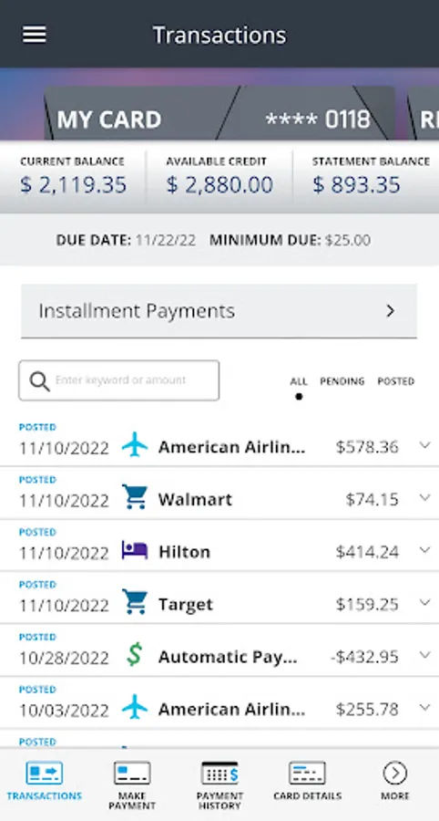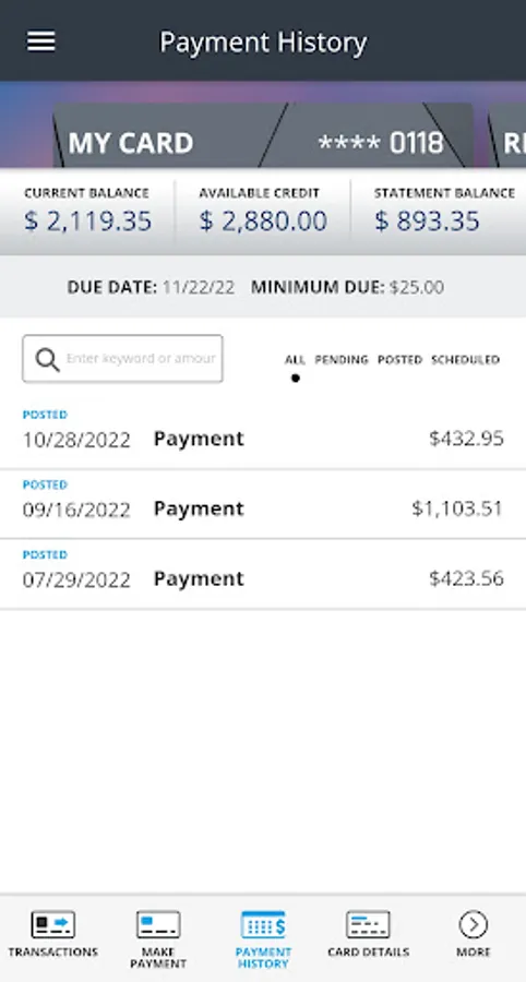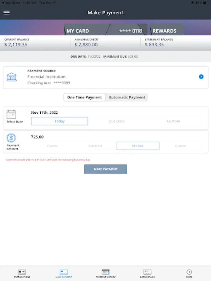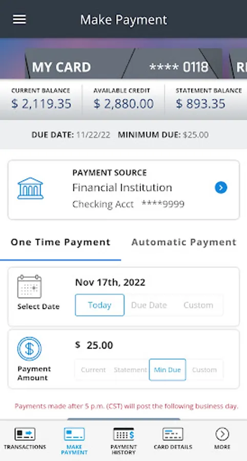 * Schedule and confirm payments from checking or savings; see payment amounts for balances and minimum due; view previous payments and cancel payments.