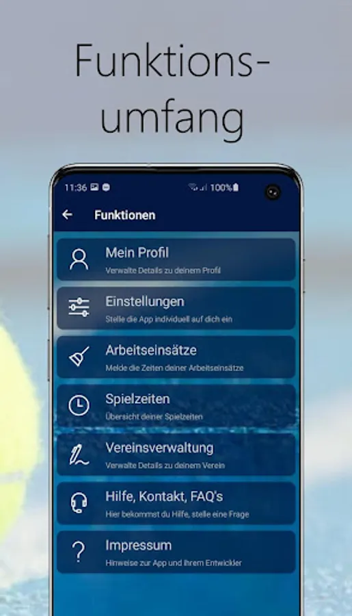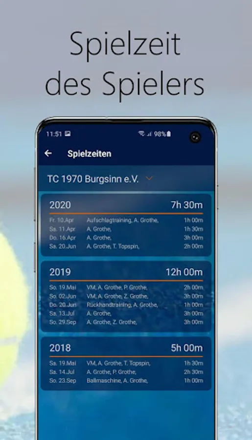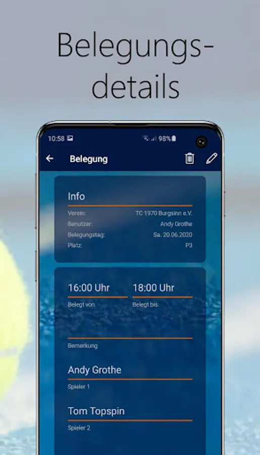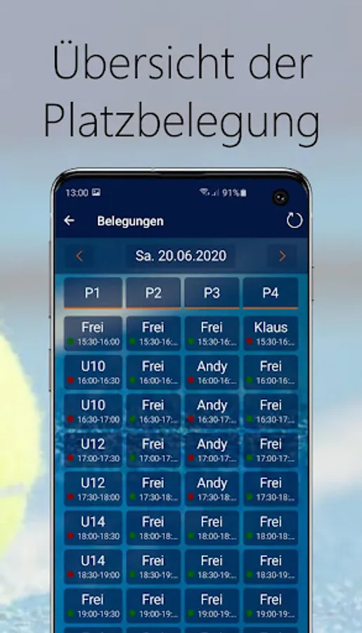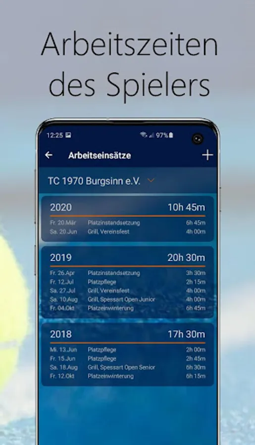 This app takes over the space allocation of tennis clubs, which was previously operated in paper form. It brings the clubs' free tennis courts together with the players. Tennis clubs can use this app to make their tennis courts available for online occupancy. Tennis players, on the other hand, can easily and easily occupy these tennis courts with this app. The playing times of the players are automatically derived from the assignments, which are displayed chronologically for each player. The same also applies to working hours. After the player has recorded his work input, it is also listed chronologically. A player can only see his own playing and working hours, while an administrator of the club can see the times of all players.