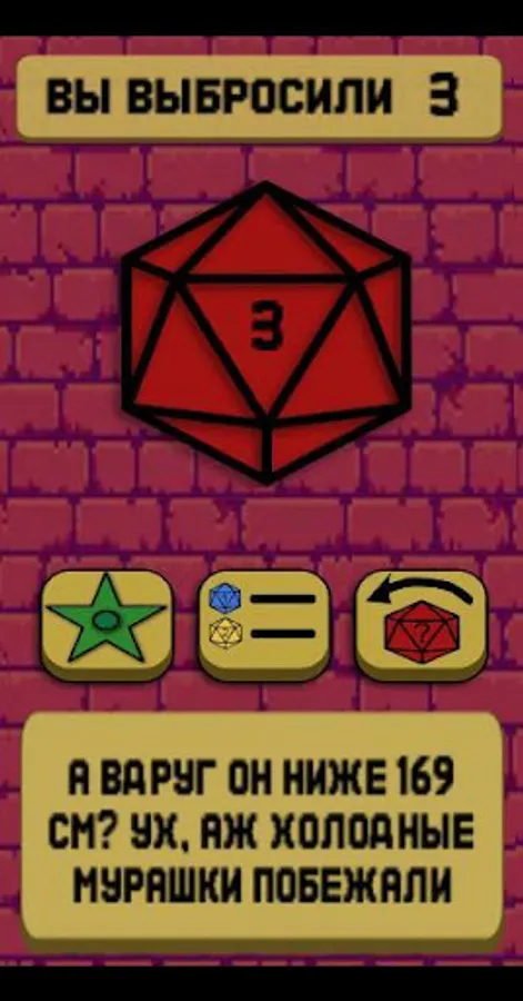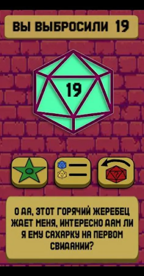 A funny application, for the indecisive or those who do not care. Roll the D20 die and get the answer to the question “Should I go on a date with this guy?”, Each answer is unique, there are also statistics on the results of throws and achievements)