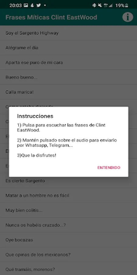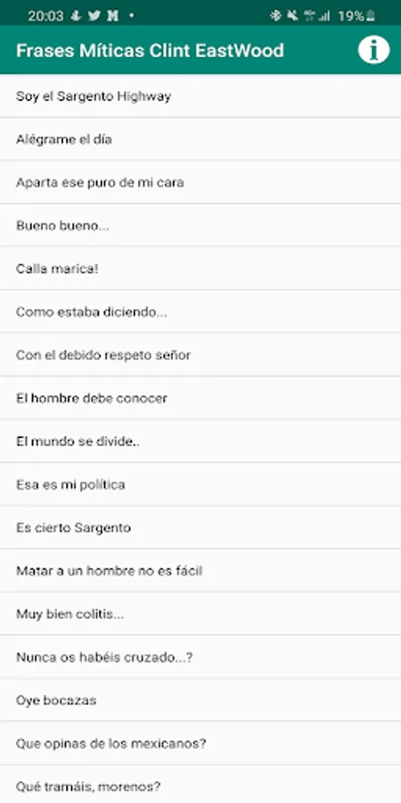 Application to enjoy listening to the most mythical phrases of the cinema of the great actor Clint Eastwood from movies such as Gran Torino, The Iron Sergeant ...
