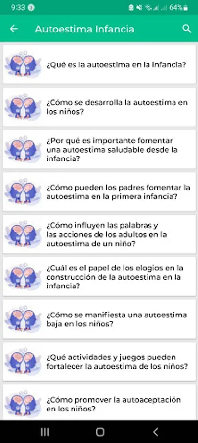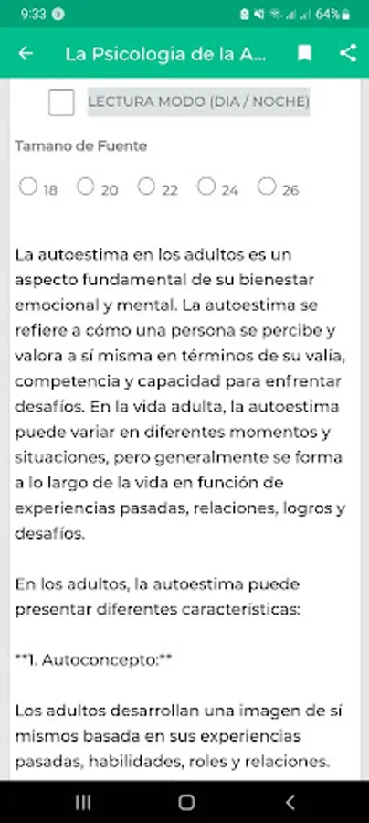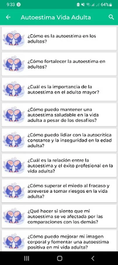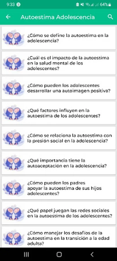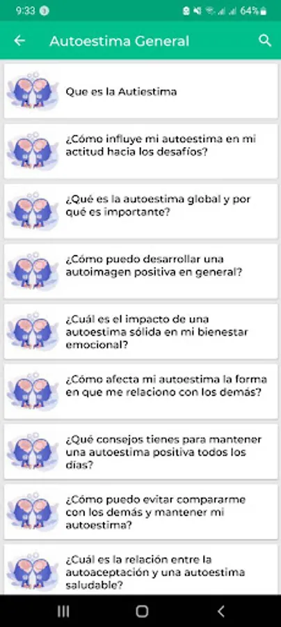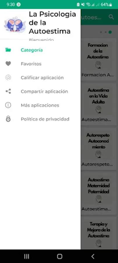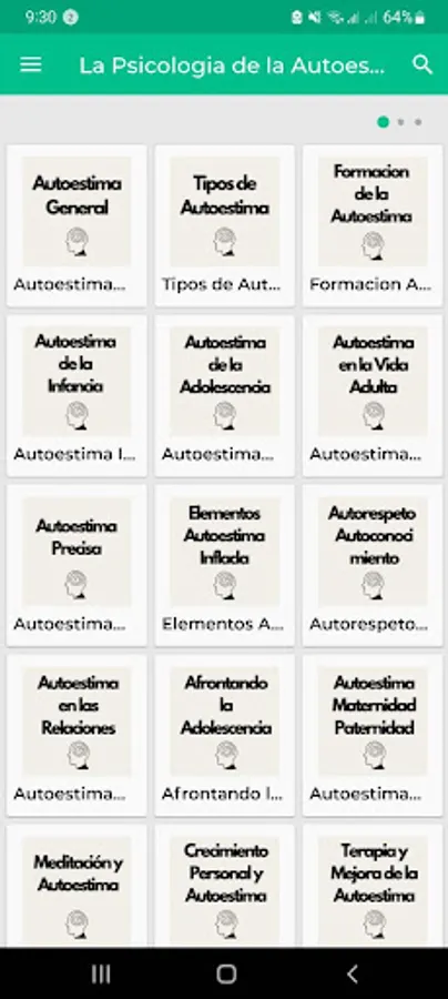 **The Psychology of Self-esteem** offers you a wide and detailed variety of categories related to self-esteem, ranging from general concepts to specific aspects in different stages of life and in various areas. Our application is a complete guide that will help you explore, understand and improve your self-esteem effectively.