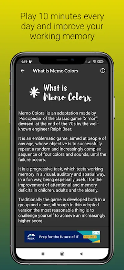 Memo Colors is an adaptation made by Psicopedia of the classic game "Simon", devised at the end of the 70s by the well-known engineer Ralph Baer.