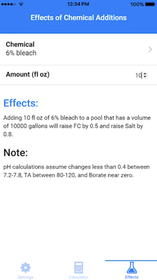 With the Effects Calculator you can measure the effects on pool chemistry of adding a given dose of: