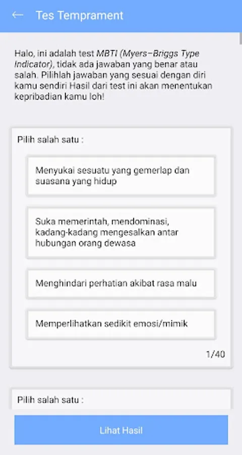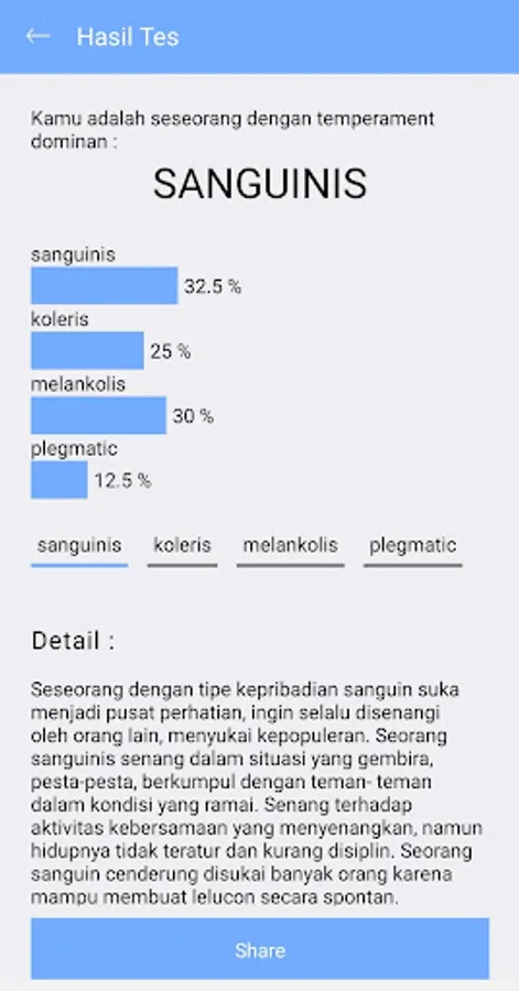 Temperament test has four characteristic : Sanguine, Choleric, Melancholic and Phlegmatic. In this personality test or psychology test will generate how much percentage that yourself belong on those characteristics.