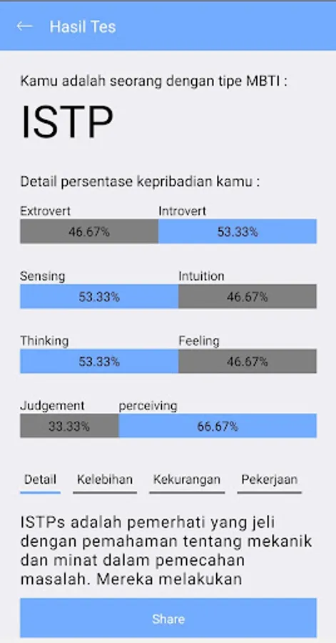 Every single people have their own percentage on every point above also each characters of Basically Myers–Briggs Type Indicator ( MBTI ) test very meaningful, their have own story, strength and weakness. So let's take your Personality Test / Psychology Test and see what are you and how to improve yourself.