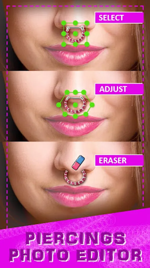 Get the most realistic piercing with Piercing Photo Editor. Piercing Photo allows you to set the piercing in any angle so it will look realistic.