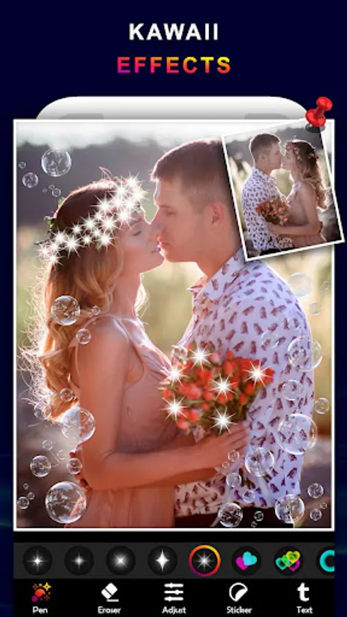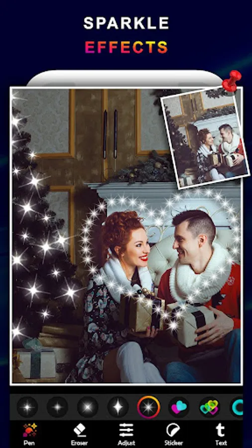 Sparkle Effects provides hand draw effects feature. Just select the picture and hand draw effects on the picture from multiple glitter dust effect patterns. Sparkle Effects also provide photo effects, sticker and text so that you can get perfect result every time.
