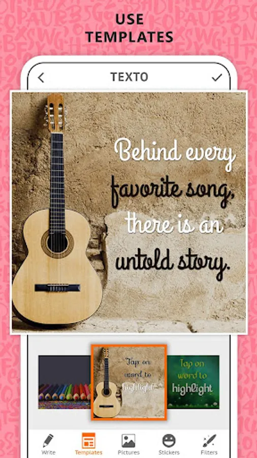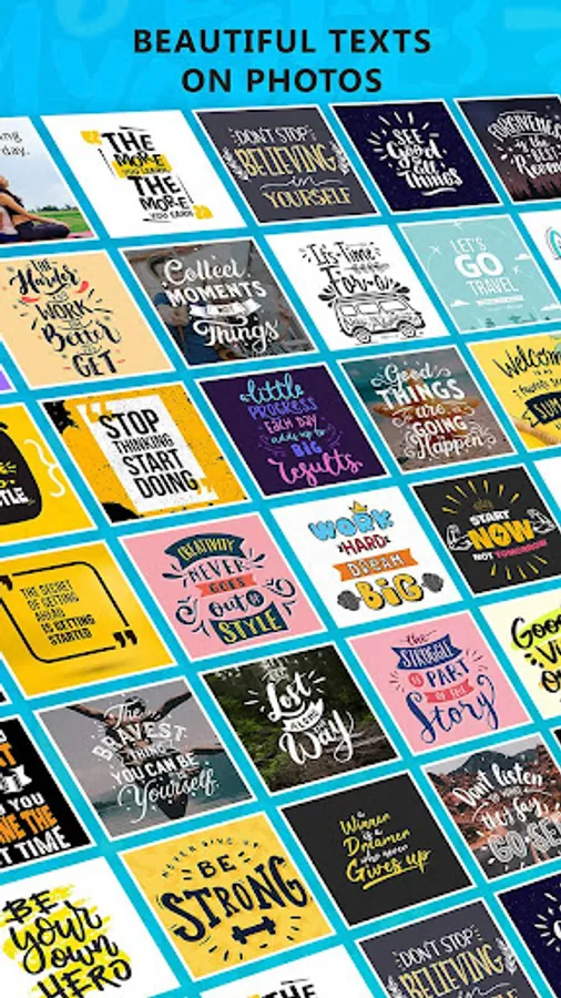 Text Over Photo comes with preset templates with beautiful backgrounds and fonts. You can also create your own Templates and reuse it. You can use your own photos and add marvelous Text Effects with little effort.