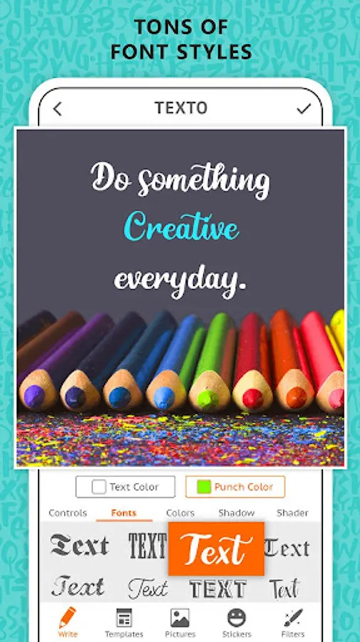 With an easy to use User Interface that allows minimal effort in placing texts on photo, Text Over Photo gives the flexibility to modify Fonts, Formats, Colors, Shaders, Shadow, Stroke and Textures of entire text or individual words.