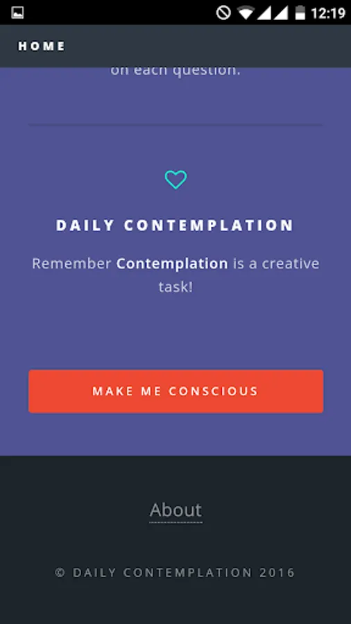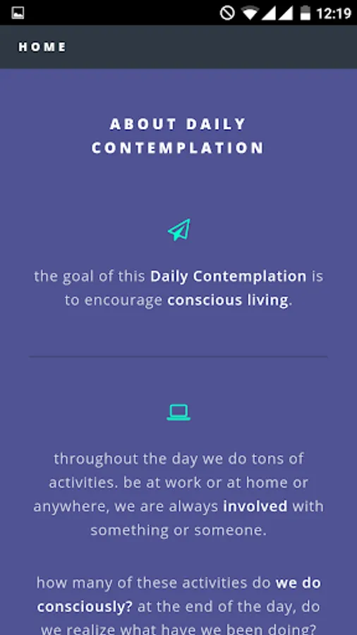 A collection of thought provoking questions aimed to raise your level of awareness. Use this app daily towards the end of each day to reach to your contemplative state of mind.