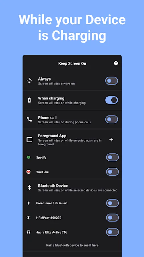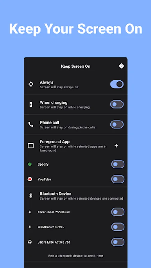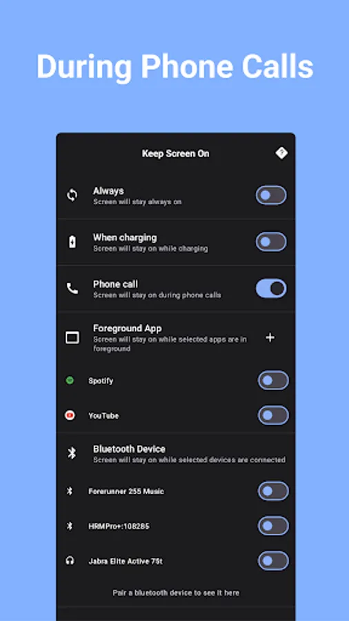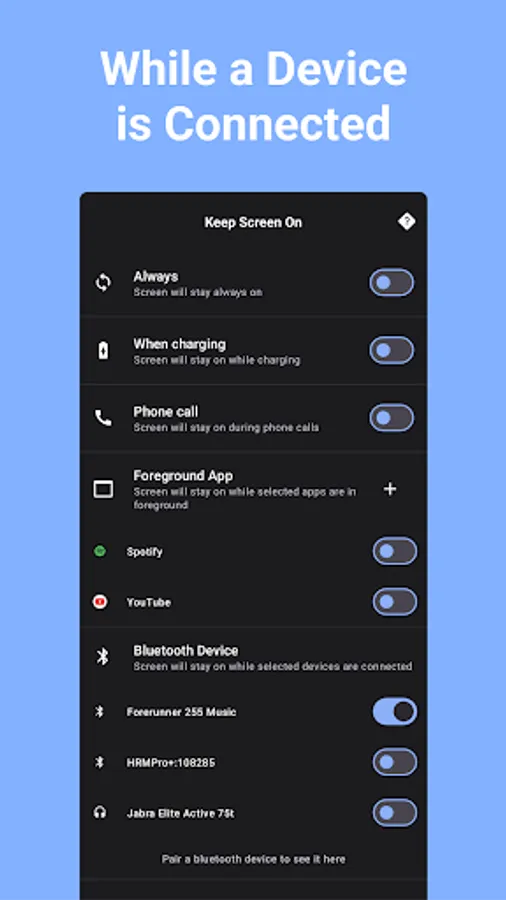 5. Keep your Screen On when selected Bluetooth Devices are Connected. (PRO only).